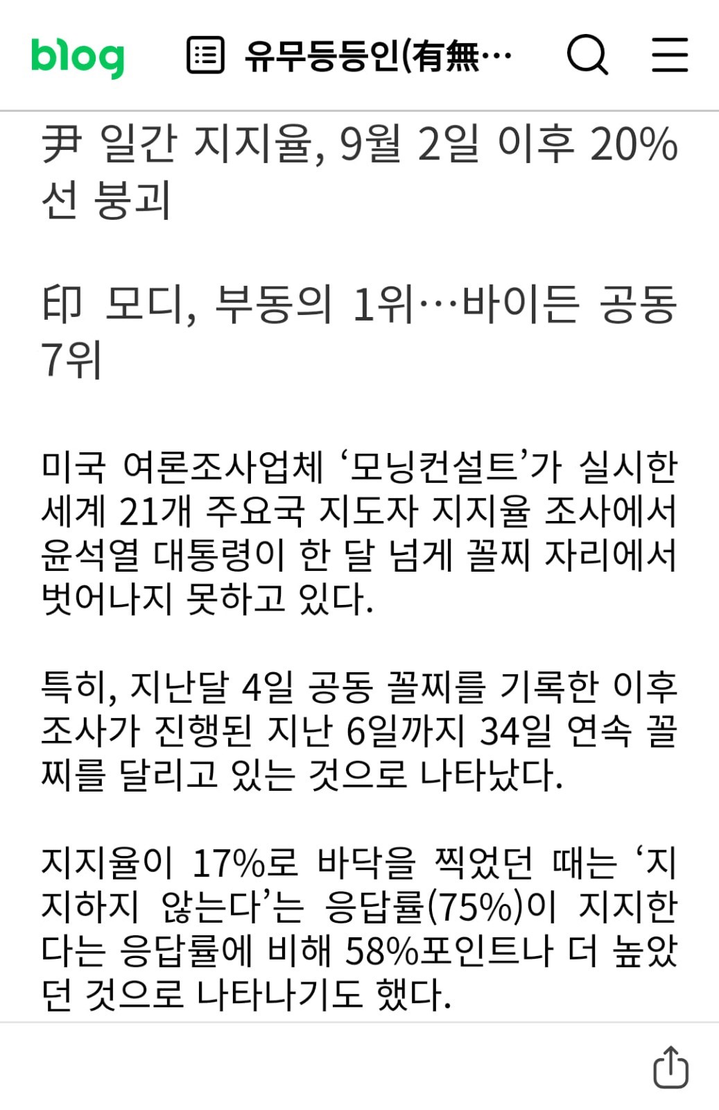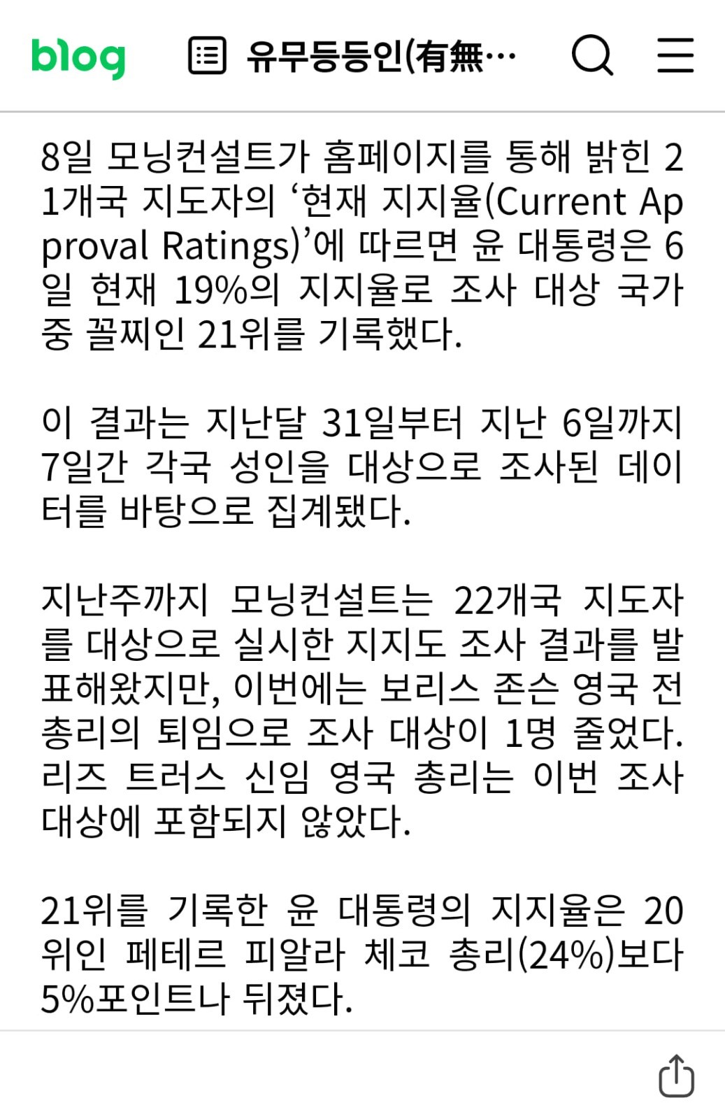 세계 주요 정상 22개국 중 지지율 :