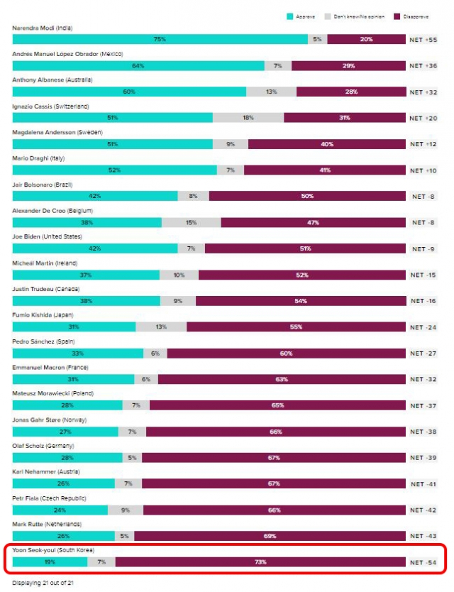 尹대통령, 한 달 넘게 세계 주요 정상 22개국 중 지지율 '꼴찌'..