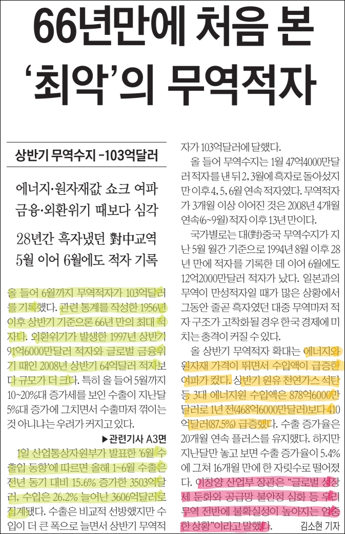 2022년 상반기 무역적자 103억 달러, 66년만에 ‘최악’의 적자이고, 환율은 1400원에 육박하고, 환율방어로 보유 달러 급격 감소 및 소비자 물가 폭등으로 서민경제는 더욱 어려워지고 있다. 무능한 정권이 대응도 초등생 보다 못해 !!!